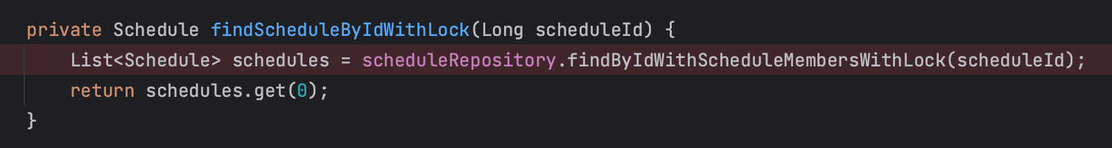 참고로 @Lock은 distinct와 같이 사용할 수 없다고 한다. 동시에 사용하려고 하면 InvalidDataAccessResourceUsageException 이 발생한다. 하지만 JPQL에서 distinct 키워드를 사용하지 않으면 일대다 관계에서 다쪽 row의 개수 만큼 일쪽 엔티티가 뻥튀기(?) 되는 잘 알려진 문제가 있다. distinct를 빼고 다시 실행해보니 예외가 발생하지 않고 동작은 잘 했지만 확인해보니 반환 타입이 List<Schedule> 로 되어있는 경우 역시나 ScheduleMember의 개수만큼 동일한 Schedule 객체가 리스트에 중복되어 포함되는 것을 확인할 수 있었다.