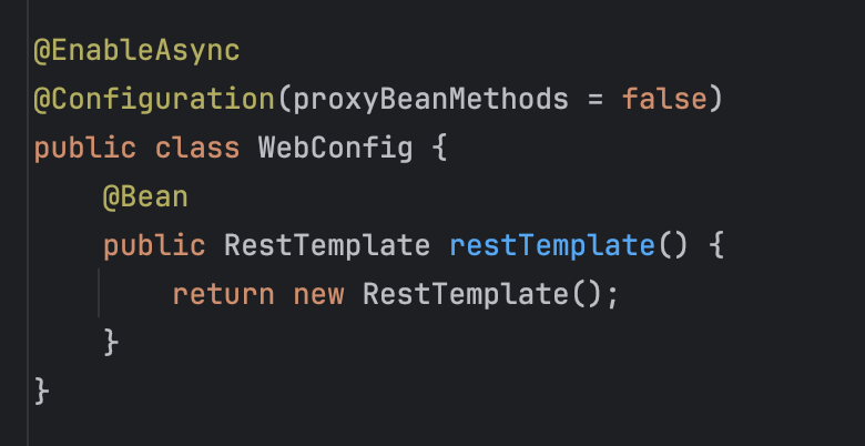@Async를 사용하려면 @EnableAsync 어노테이션을 설정 파일에 달아주어야 한다. 기존에는 아래와 같이 WebConfig에 같이 달아주고 있었는데,