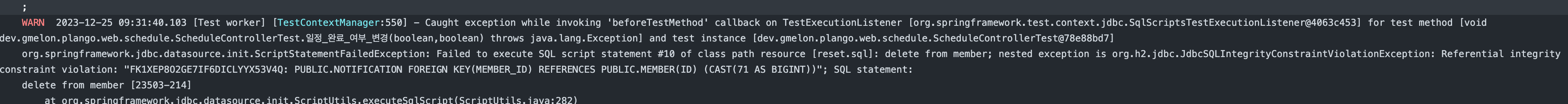 그 예시로, 위의 경우 테스트 완료 후 수행하는 reset.sql 에서 알림 테이블을 지울 때 존재하지 않던 알림이 (비동기로 실행되어) 회원 테이블을 지울 때 존재하게 되는 상황이다. 때문에 외래키 무결성 위반으로 오류가 발생했다.