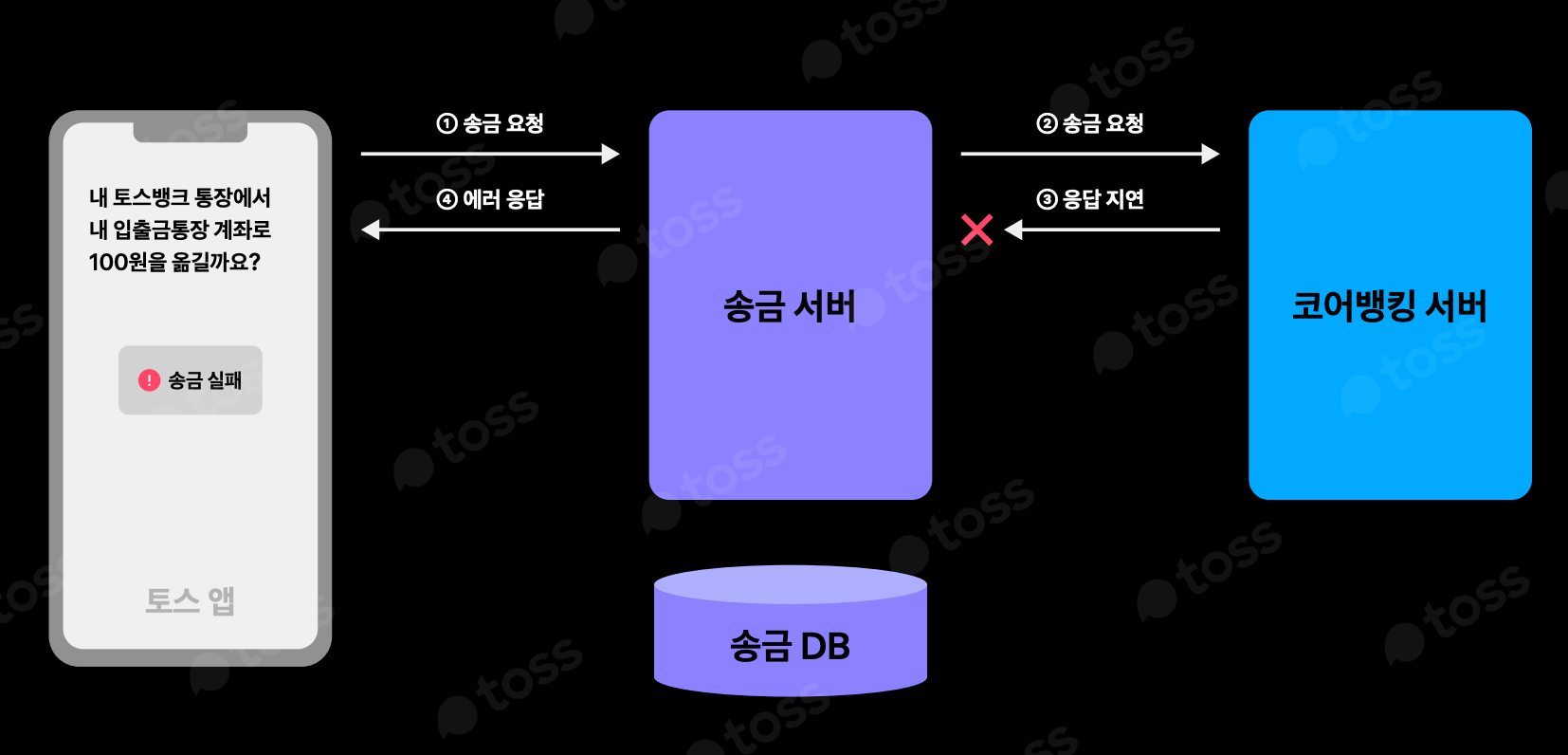 문제: 송금 실행 중 코어 뱅킹 서버의 응답이 늦어져 타임아웃이 발생하면, 송금 서버는 응답을 받지 못해 거래 내역을 DB에 저장하지 못한다.