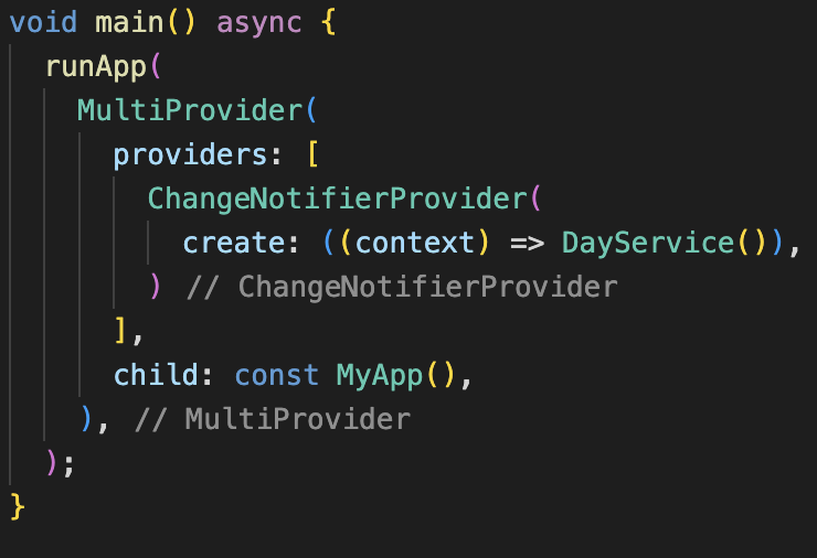 DayService 에서 데이터를 변경하고 notifyListeners() 를 호출하면 아래 코드처럼 Provider 라는 것의 아래에 위치한 child 들은 화면을 그리는 함수인 build() 가 재호출되면서 데이터가 갱신되어 출력되는 방식이다.