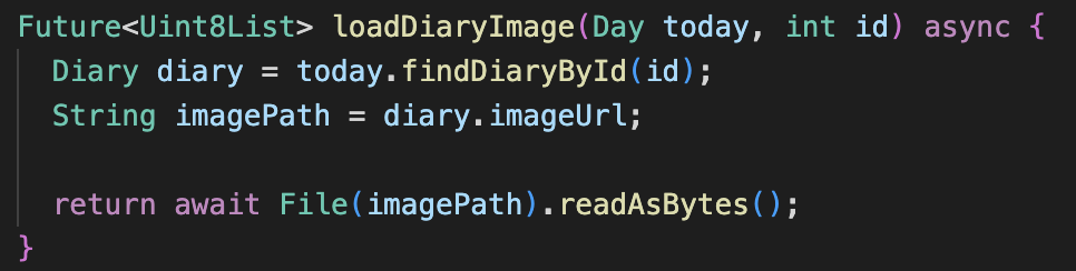 그리고 읽어올 때는 Diary 객체에서 파일 주소를 읽어와 해당 주소에 저장된 바이트 배열을 다시 File로 변환해 반환한다. UI단에서는 Image.memory(파일주소) 함수를 통해 이미지를 읽어오게 된다.