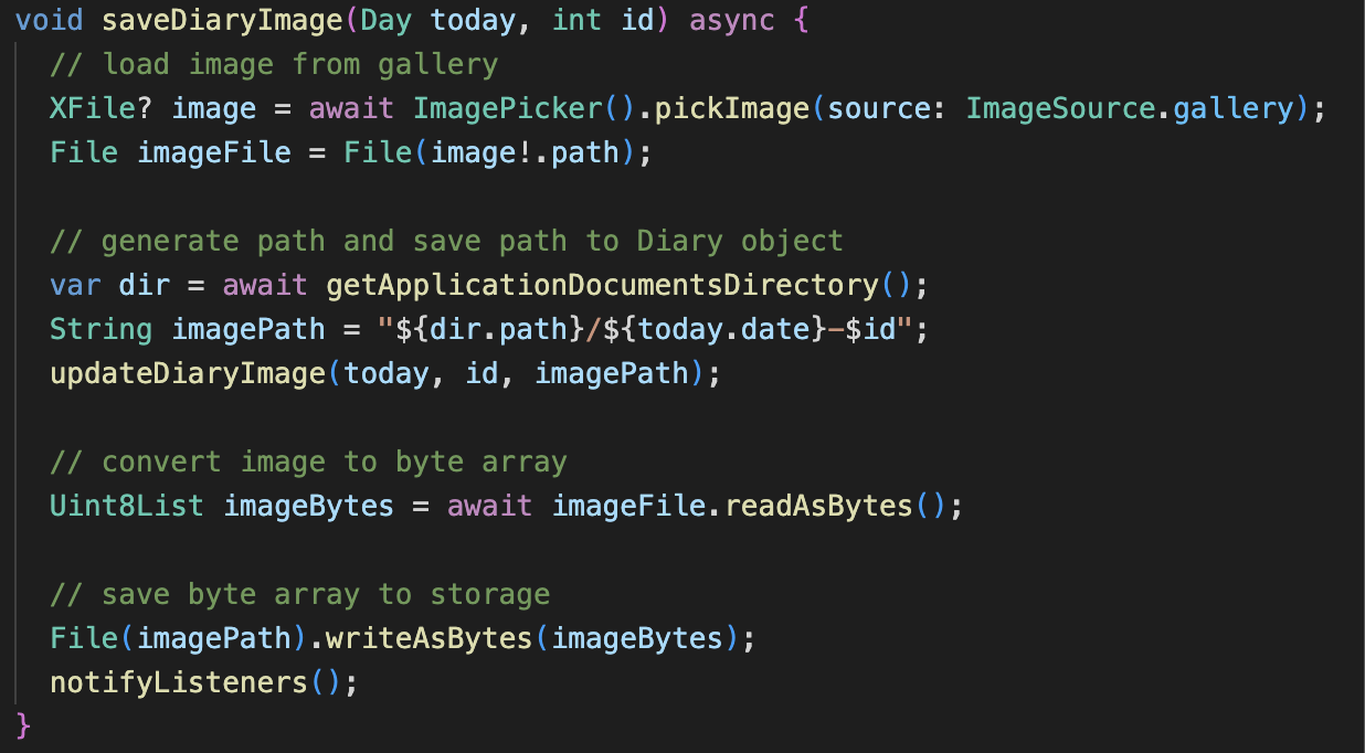 이미지 저장도 만만하게 봤다가 엄청 고생했는데, 우선 UX 측면에서 이미지를 조절할 수 없다거나 크기가 잘리는 등 문제는 차치하더라도 이미지를 앱 내 저장소에 저장하는게 생각보다 너무 까다로웠다. 아마 이 부분도 백엔드가 구현되면 차라리 더 쉽게(?) 해결되지 않을까 생각한다! 결과적으로는 아래와 같이 ImagePicker 로 기기의 이미지를 불러와 File 로 변환하고, 바이트배열로 변환하여 새로운 파일에 쓰도록 구현했다. 그리고 새롭게 저장된 파일의 주소를 Diary 객체에 저장한다.