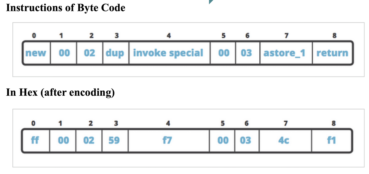 aload_0,invokesspecial #1과 같은 명령어들은 모두 hex로 변환되어 JVM 메모리에 들어가게 됨