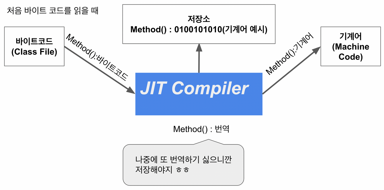 - JIT (Just-In-Time) 컴파일러는 런타임 시 바이트 코드를 OS 시스템 코드로 컴파일 후 저장하여 성능을 개선함