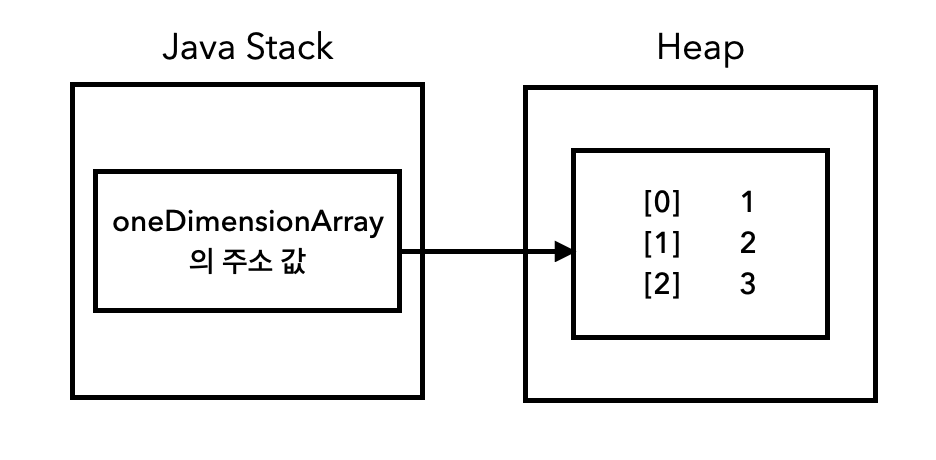 Runtime Data Area의Java Stack내부에 생성되며, 실제 배열 값들은Heap영역에 저장됨 - 1차원 배열