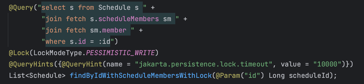 참고로 @Lock은 distinct와 같이 사용할 수 없다고 한다. 동시에 사용하려고 하면 InvalidDataAccessResourceUsageException 이 발생한다. 하지만 JPQL에서 distinct 키워드를 사용하지 않으면 일대다 관계에서 다쪽 row의 개수 만큼 일쪽 엔티티가 뻥튀기(?) 되는 잘 알려진 문제가 있다. distinct를 빼고 다시 실행해보니 예외가 발생하지 않고 동작은 잘 했지만 확인해보니 반환 타입이 List<Schedule> 로 되어있는 경우 역시나 ScheduleMember의 개수만큼 동일한 Schedule 객체가 리스트에 중복되어 포함되는 것을 확인할 수 있었다.