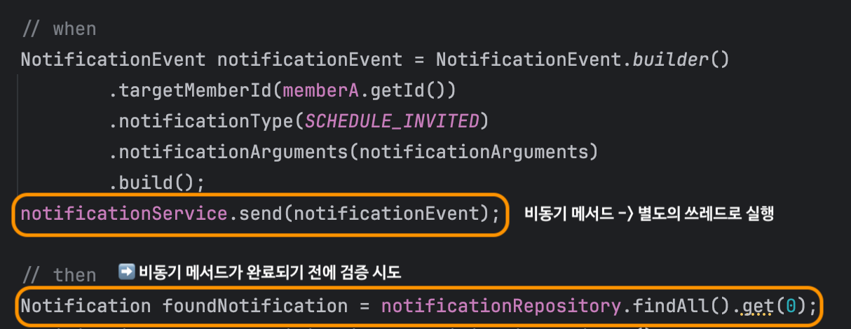 알림 발송 로직을 비동기로 처리하고 테스트를 수행하려니 아래와 같이 알림 발송을 검증하는 테스트가 깨지는 문제가 생겼다.