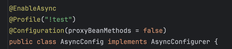 이를 AsyncConfig로 분리해주고 test가 아닌 프로필에서만 빈으로 등록되도록 해주었다.