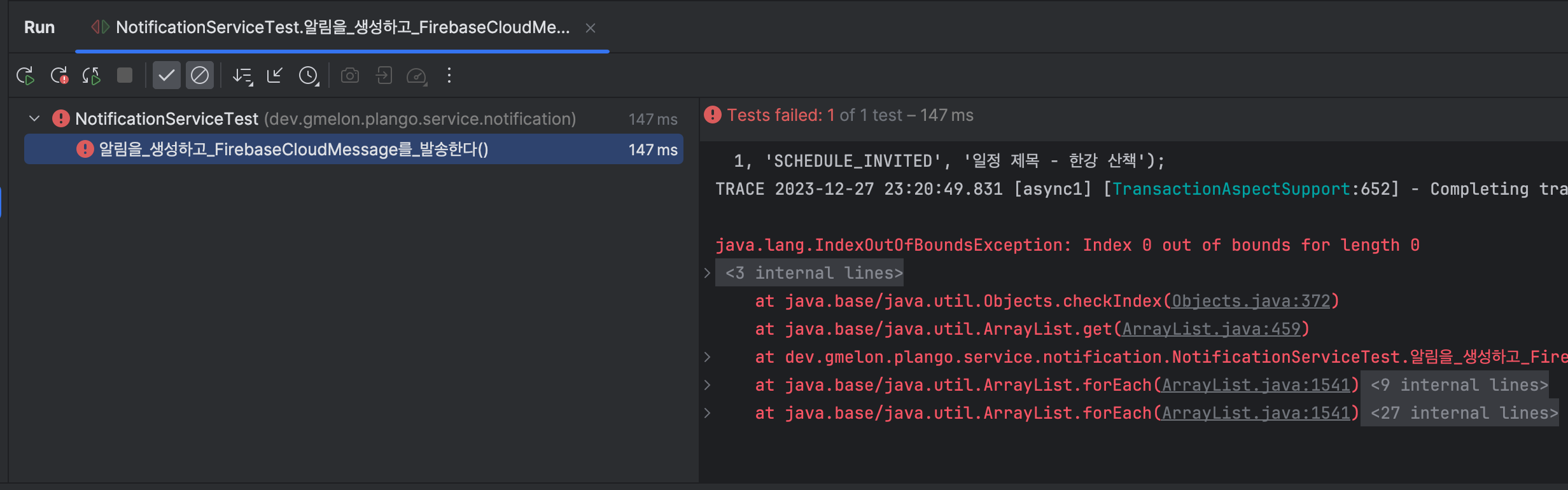 알림 발송 로직을 비동기로 처리하고 테스트를 수행하려니 아래와 같이 알림 발송을 검증하는 테스트가 깨지는 문제가 생겼다.