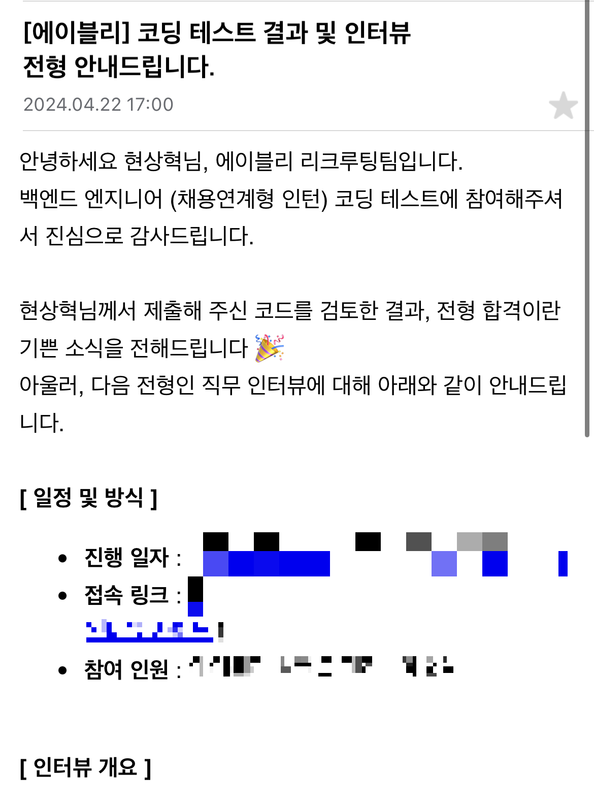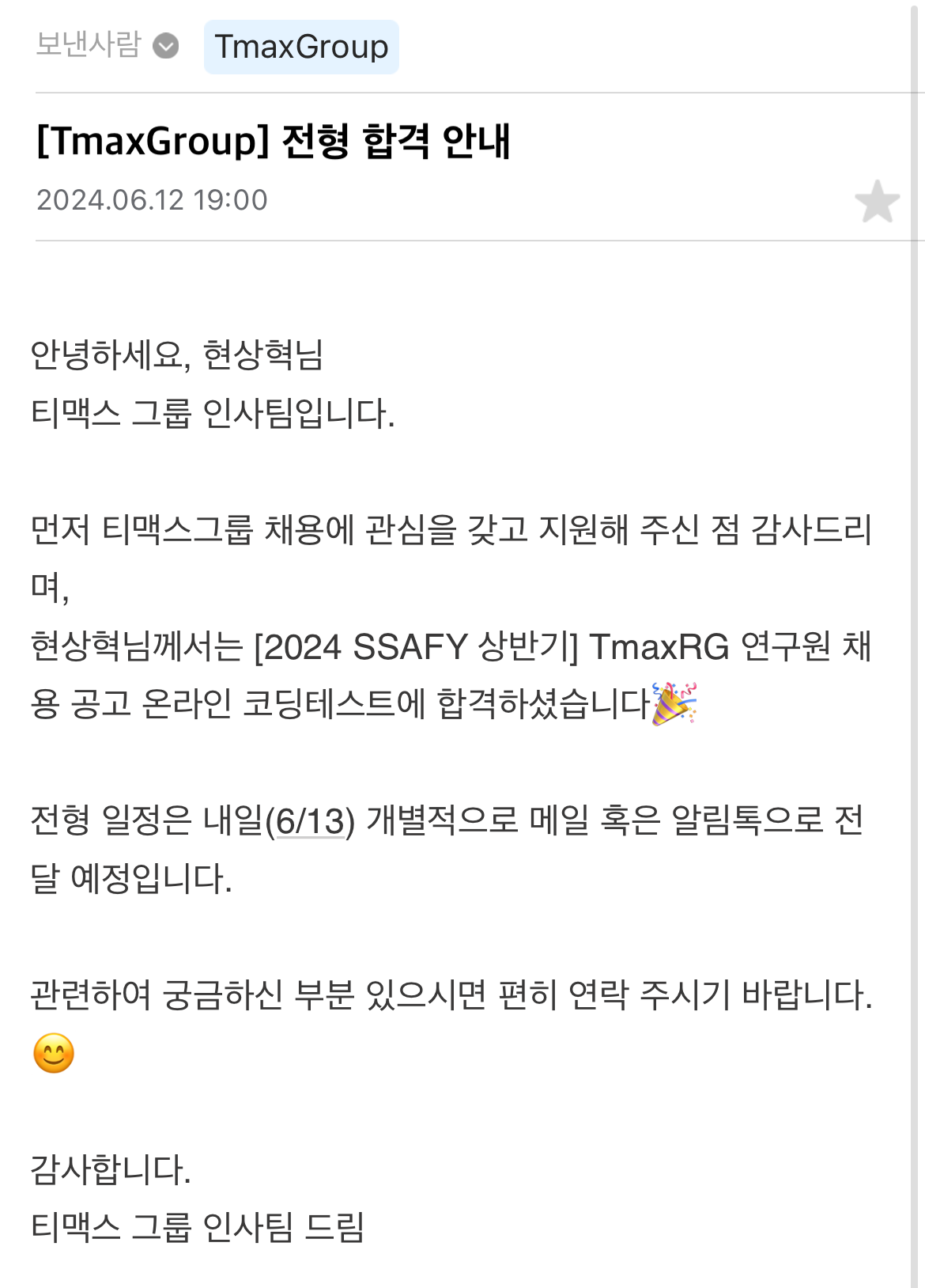 그리고 6월 말, 한창 싸피 2학기 준비를 하고 있는 와중에 싸피 잡페어를 통해 면접을 본 회사에서 최종 합격 연락을 받게 되었다. 싸피 2학기에 대한 기대가 컸기에 어떻게 하는 게 좋을지 고민이 많이 되었지만 경력을 쌓으면서 또 다른 방향의 성장을 해나갈 수 있을 것이라는 기대 반 두려움 반을 안고 입사를 결정했다. 입사 여부를 회신해야 하는 마감날짜가 2학기 시작 하루 전인가 그랬어서 결정 후 사무국에 바로 전화를 드려 퇴소 절차를 진행했다.