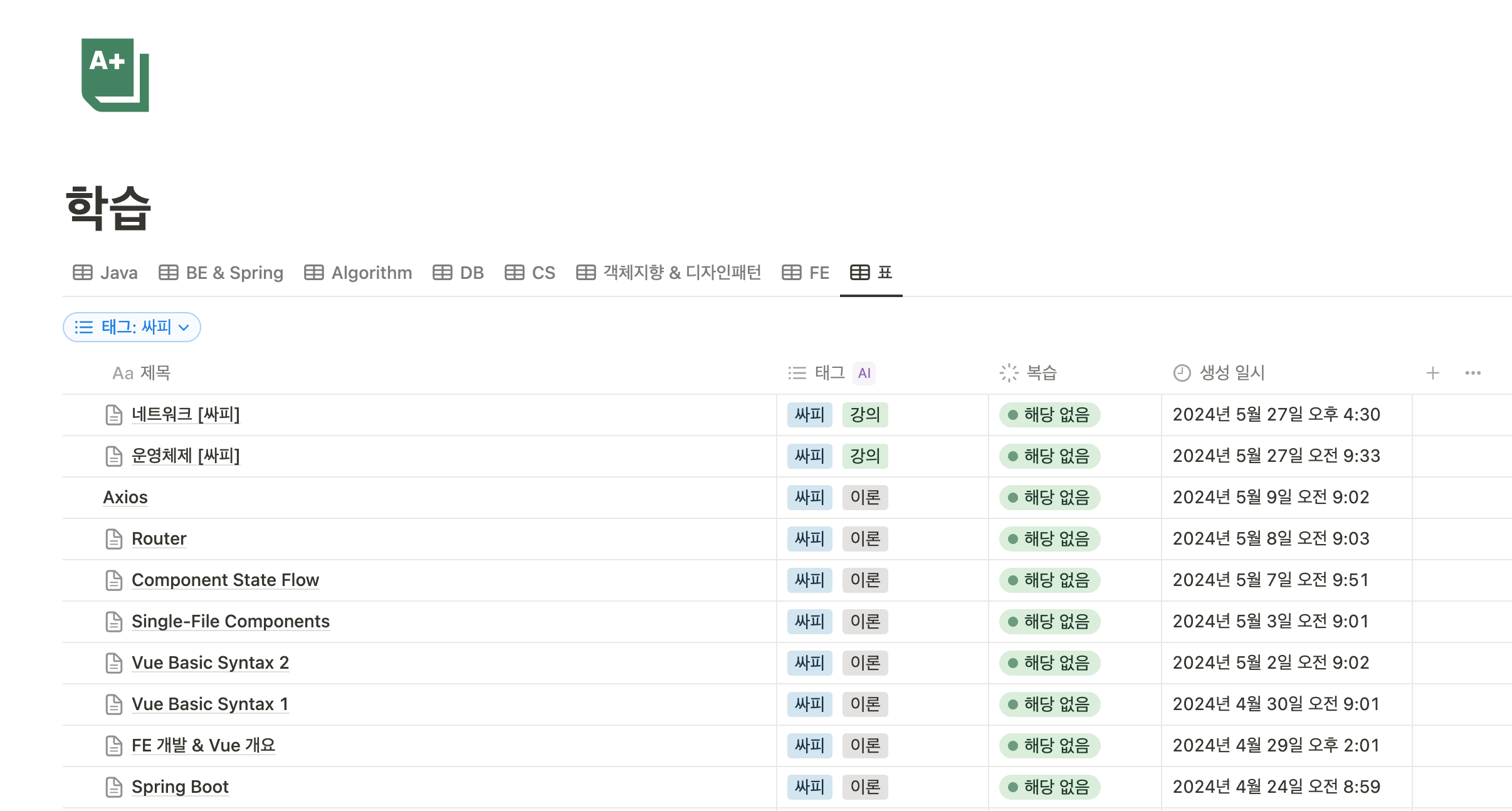 아래처럼 노션에 내용을 정리하면서 공부했다. 각 페이지 별로 내용도 꽤 많고 개수도 70개가 넘는 것을 보고 그래도 열심히 공부했구나 하는 뿌듯함이 있었다.