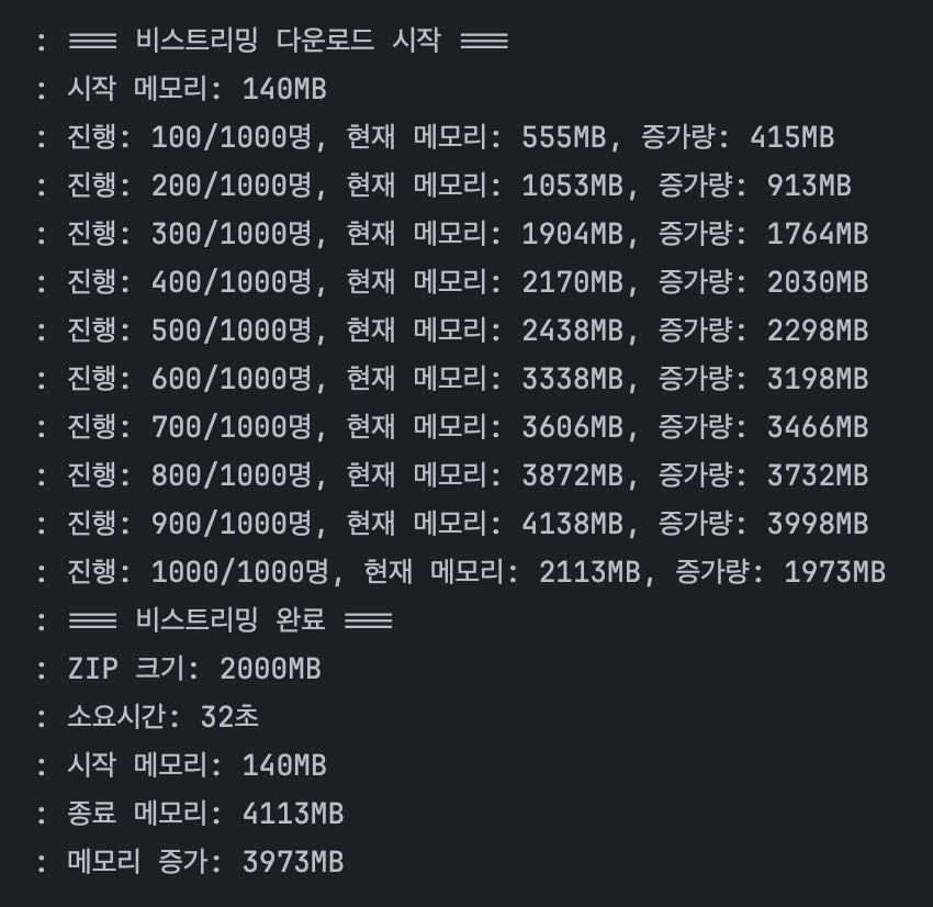 * 비스트리밍 방식 - 1000명 유저 데이터를 전부 메모리에서 ZIP으로 압축 후 한번에 반환