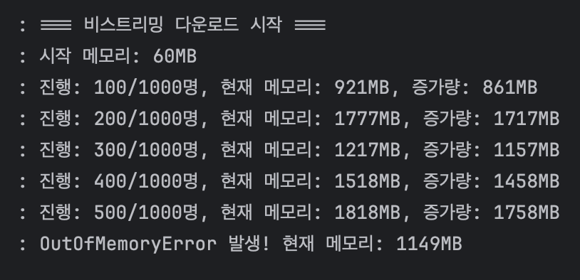 log.info("진행: {}/{}명, 현재 메모리: {}MB, 증가량: {}MB", i, userCount, currentMemory, currentMemory - startMemory);