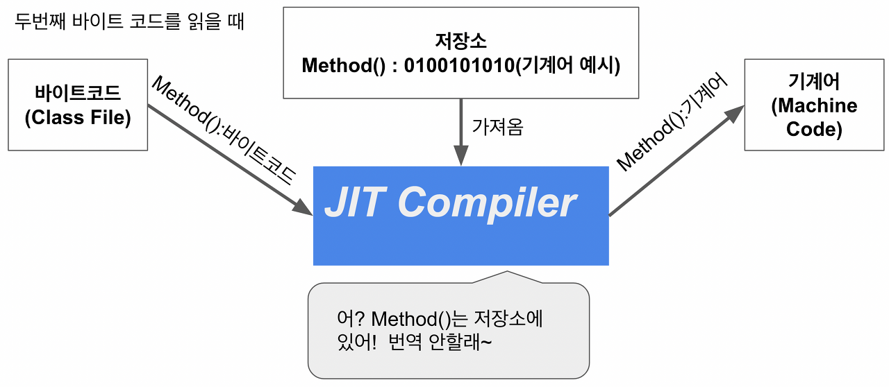 - 한번 컴파일된 메소드는 다시 컴파일하지 않고 저장소에서 불러와 바로 호출