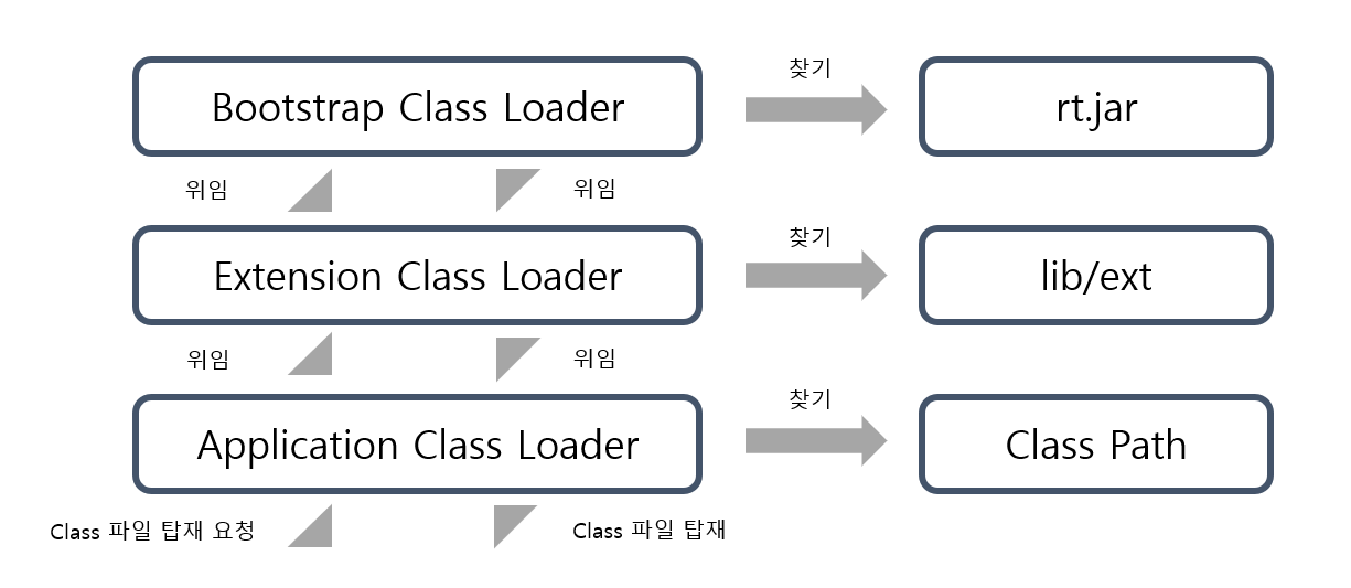Application Class Loader로 클래스 파일 탑재 요청이 들어오면, 곧바로 최상단의Bootstrap Class Loader로 요청을 위임한 뒤, 최상단에서부터 클래스 파일을 찾아서 내려옴. - 상단에서 못찾으면 다시 그 하위에서 찾고, 또 못찾으면 다시 하위로 요청을 내려보내는 방식.