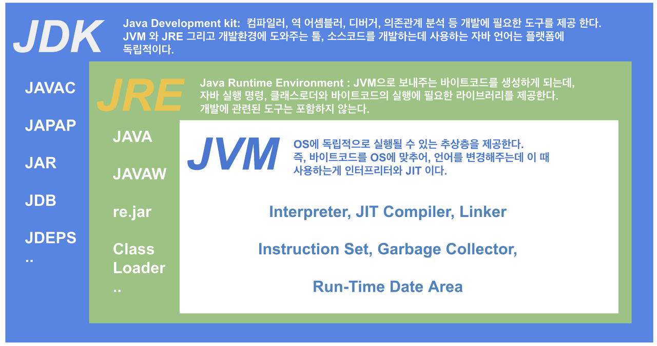 - JDK에는 JRE에 없는 개발에 필요한 툴(디버거, 컴파일러 등)을 포함