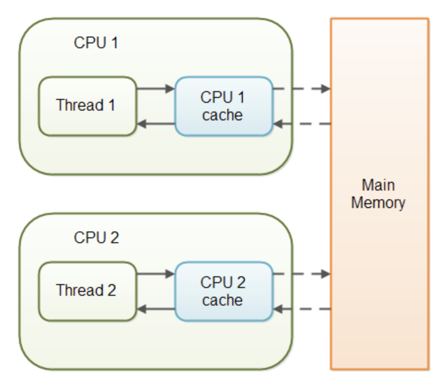 메인 메모리에 저장하지 않고CPU Cache에 저장한다- 멀티 쓰레드 환경에서는 쓰레드가 변수의 값을 읽어올 때 각 쓰레드의