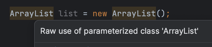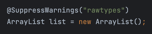 예를 들어 아래와 같이 ArrayList를 제네릭 명시 없이 사용하면 경고가 발생하는데,