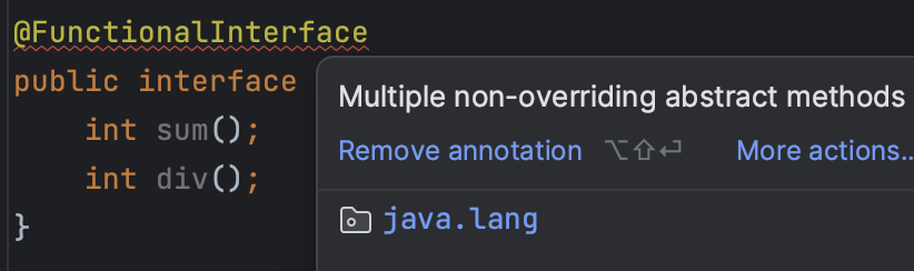 @FunctionalInterface가 없으면 여러 추상 메서드가 가능하지만, 아래와 같이 붙여주면 컴파일러 레벨에서 오류를 발생시켜준다.